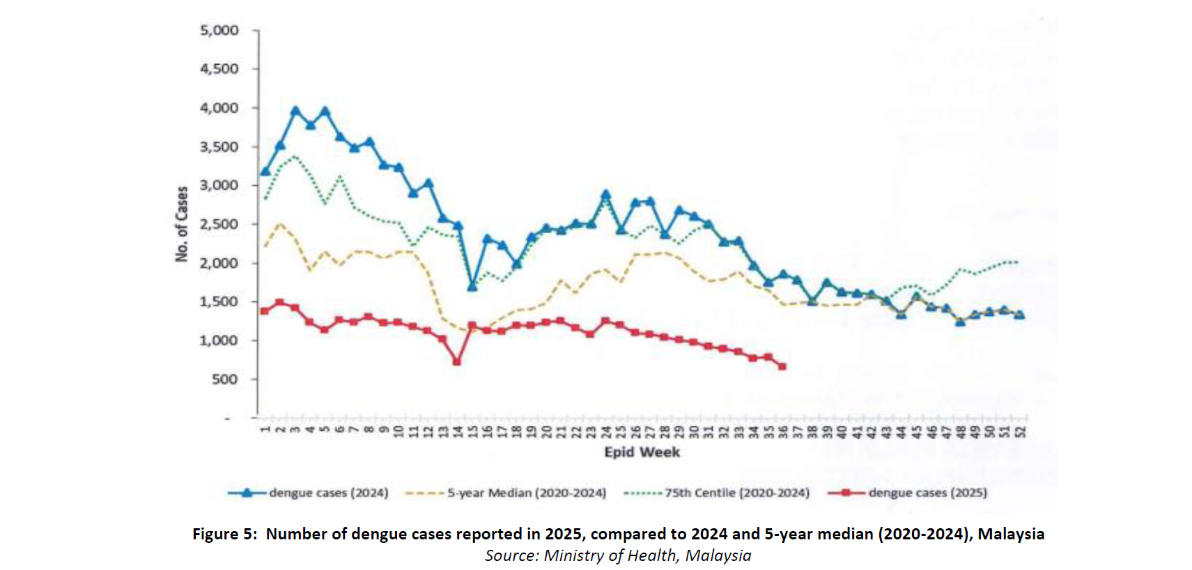 In epidemiological week 36 of 2025 (31 August to 6 September 2025), 664 new dengue cases and no death were reported in Malaysia, a decrease from 794 cases in week 35 (Figure 5). There was a decreasing trend in number of cases from week 24. Cumulatively, 40 280 cases have been reported in 2025.