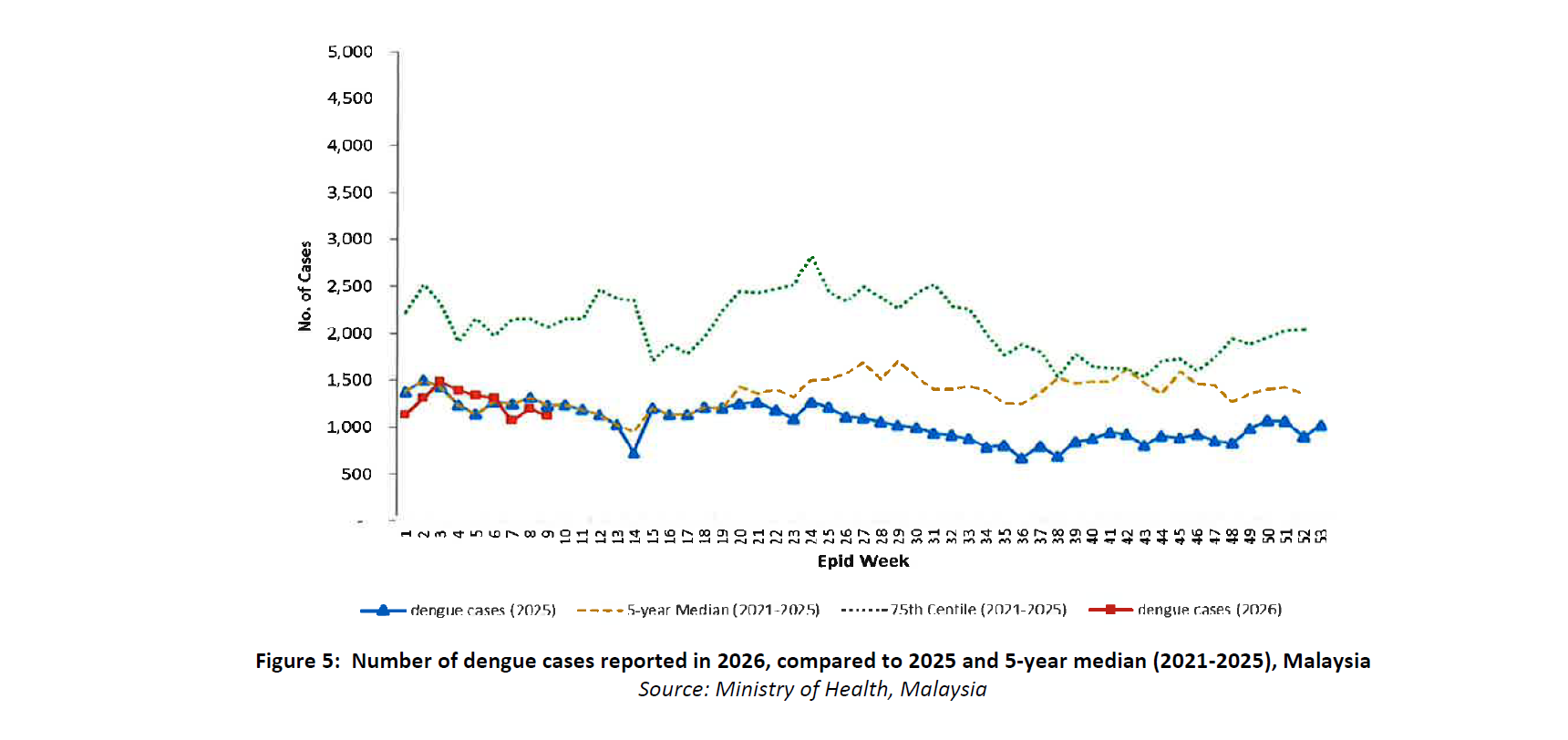 In epidemiological week 9 (1 to 7 March 2026), 1 116 new dengue cases, were reported in Malaysia, a decrease from 1 197 cases in week 8 (Figure 5). In the same reporting period, one new death was reported. Cumulatively, a total of 11 340 cases, including nine deaths, have been reported in 2026.