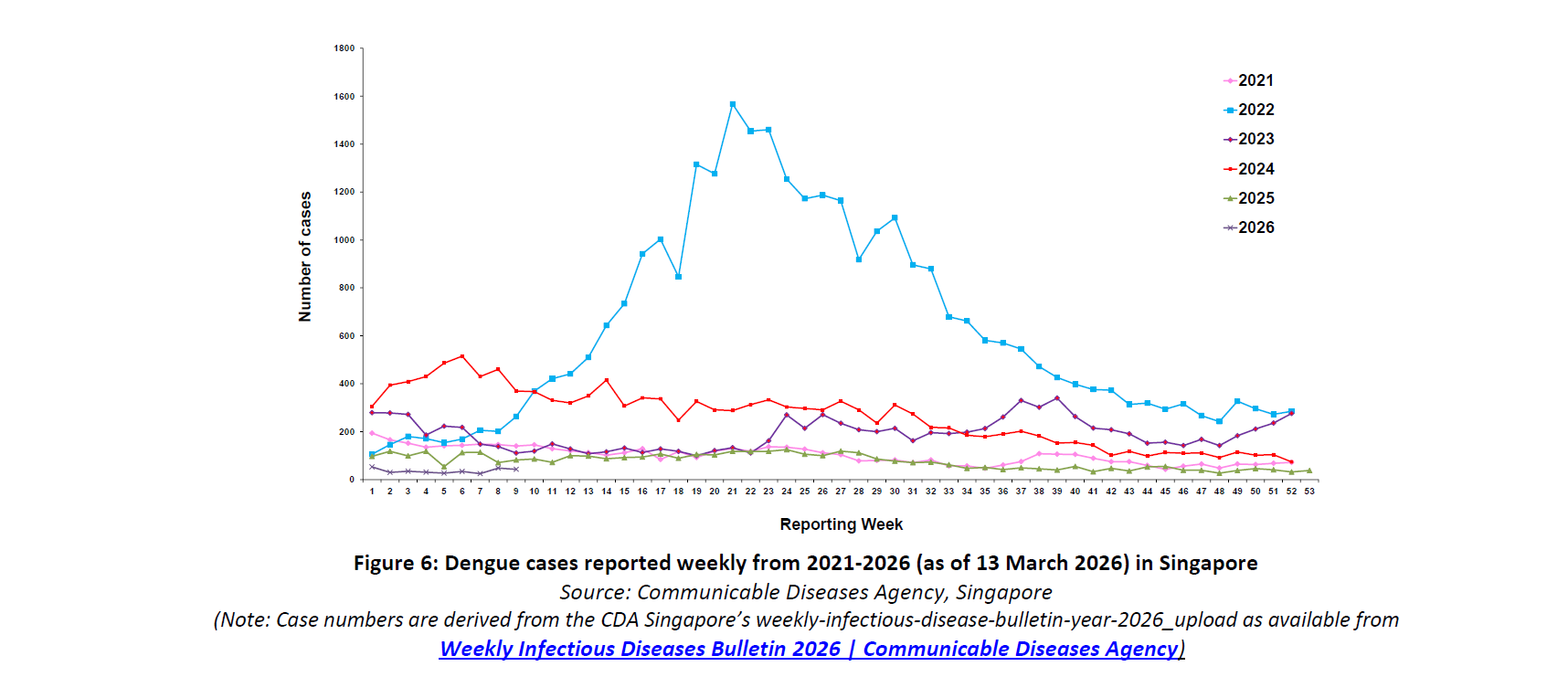 In epidemiological week 9 (1 to 7 March 2026), a total of 43 dengue fever cases, with no dengue haemorrhagic fever cases, were reported in Singapore. This is a 47.6% decrease compared to the same period in 2025 (n=82). Preliminary results of all positive dengue samples serotyped in February 2026 showed DEN-1, DEN-2, DEN-3 and DEN-4 at 3.2%, 71.0%, 19.4% and 6.5% respectively. Cumulatively, a total of 322 cases have been reported in 2026.